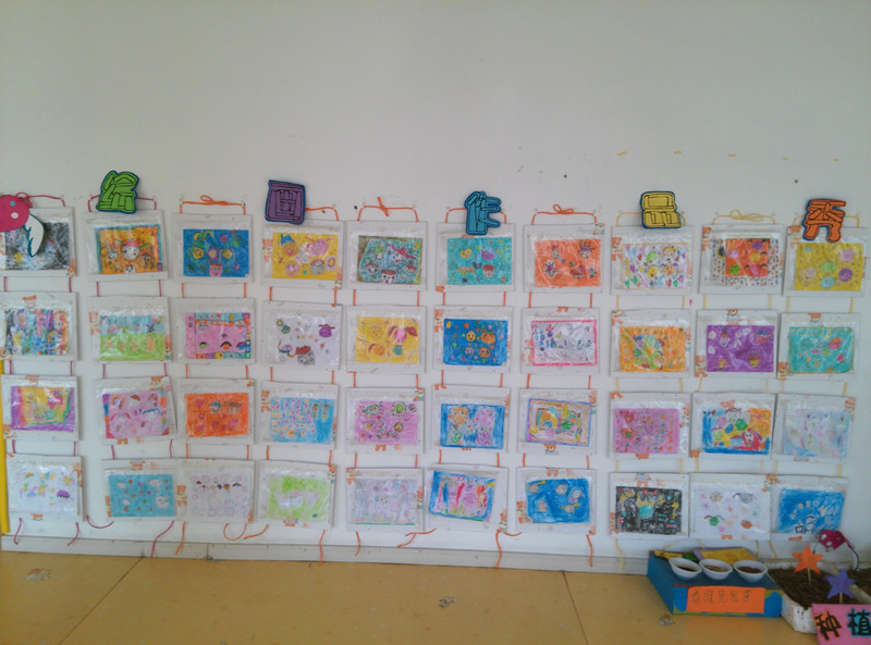 我们的画已经展出来了,好看吗?爸爸妈妈,你们知道哪一幅是我画的吗?