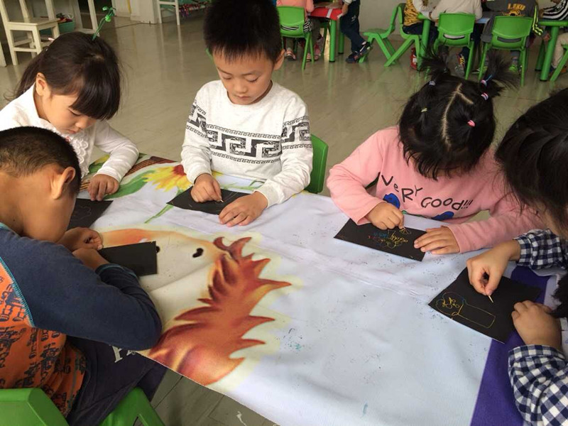 今天,我们小朋友学了新的本领,秋天的树叶,不仅仅是画出来那么简单哦,我们要在刮蜡纸上用牙签慢慢的勾画出美丽的秋天,各种景象,树叶变黄了,树叶落了下来,苹果树长除了好多苹果等许多象征着秋天的到来,我们又学会了一种画画的方法哦!