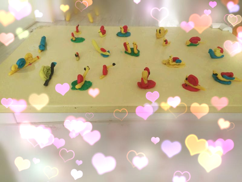 这就是我们做的小蜗牛,有各种不同的颜色,每一只小蜗牛也都长得不一样,漂亮吧!